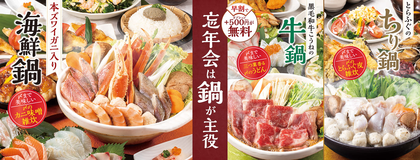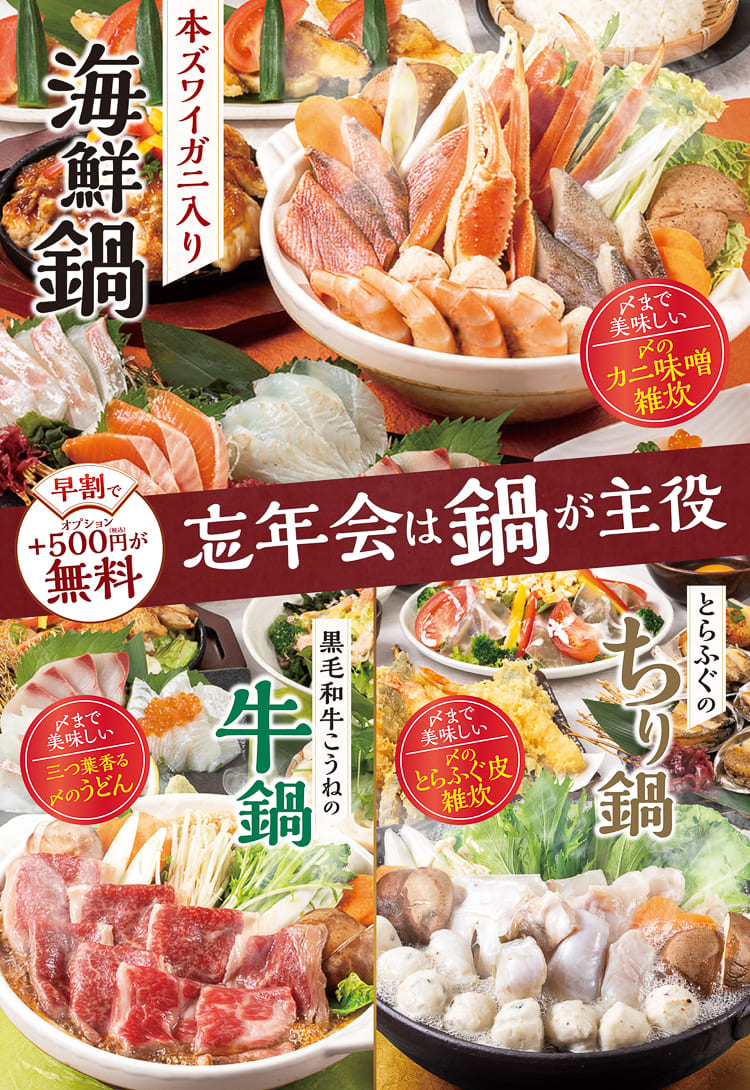 2025年も残り僅か!今年を締めくくる忘年会に〆のカニ味噌雑炊まで美味しい「本ズワイガニ入り海鮮鍋」、豪華「とらふぐのちり鍋」「黒毛和牛こうねの牛鍋」をご用意♪