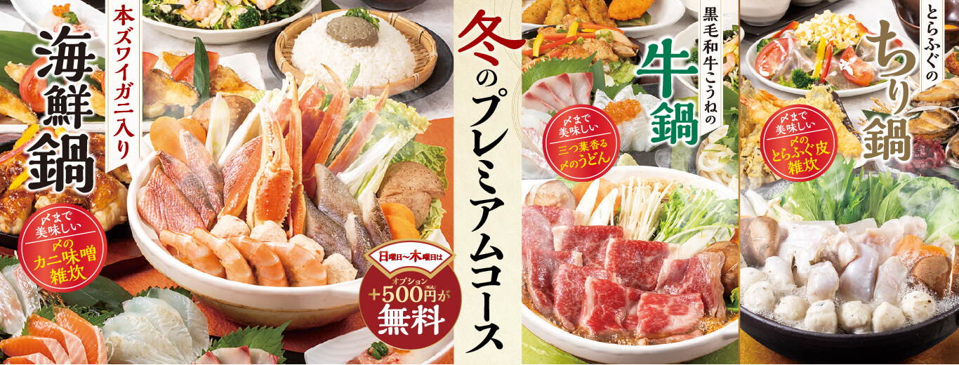 【冬のプレミアムコース】日~木曜「飲放3時間」or「全ドリンク飲放」+500円分の特典が無料!