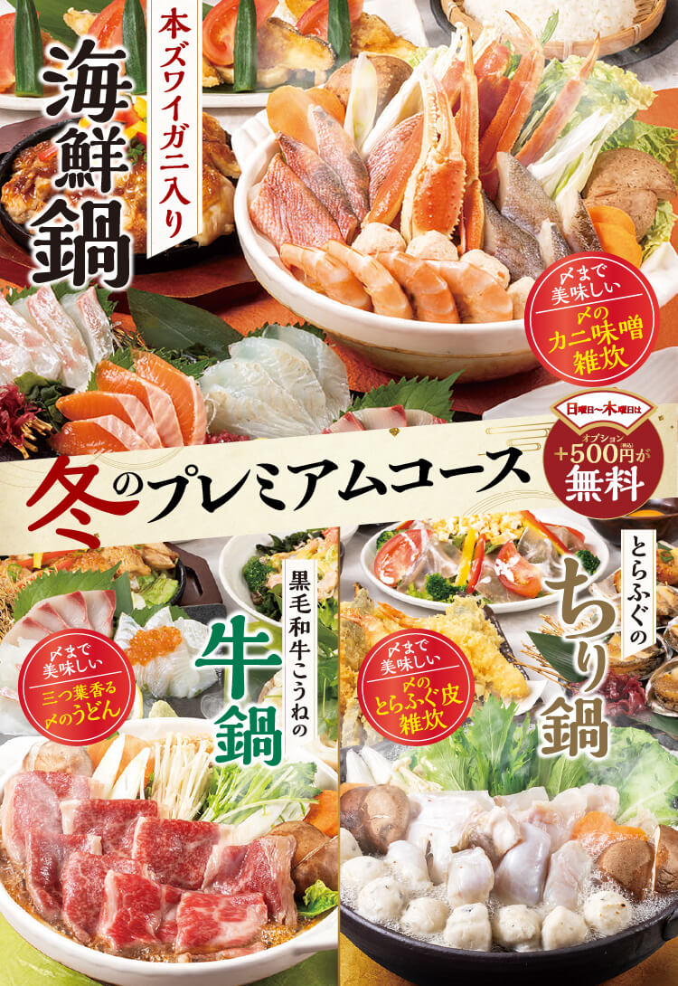【冬の各種宴会に◎選べる予約特典付】本ズワイガニorとらふぐor黒毛和牛から選べる豪華鍋コース「冬のプレミアム」が4500円~